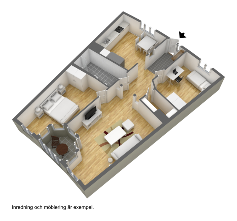 Här erbjuds en rymlig och välplanerad lägenhet med ljusa väggar och genomgående parkettgolv som skapar en stilren och enhetlig känsla.