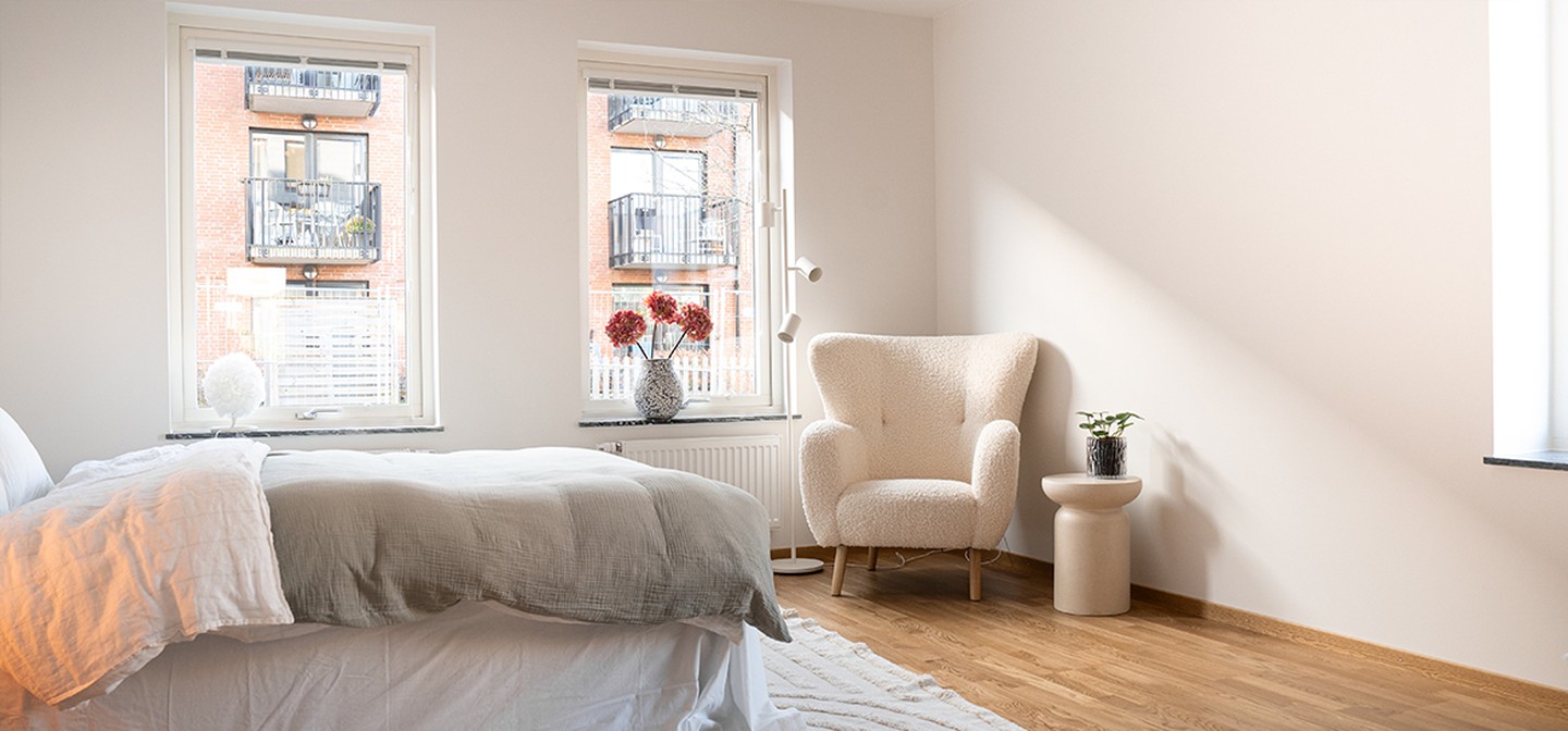 I hallen finns det plats för ytterkläder samt extra förvaringsmöjligheter, antingen i eller i anslutning till hallen. Från hallen möts du av en öppen planlösning i modern design med ljus ekparkett, vita väggar och fönsterpartier som skapar en ljus och en luftig känsla. Denna neutrala bas erbjuder möjligheter att inreda precis som du vill. Köket är stilrent med vita släta skåpsluckor och rostfria vitvaror. Här hittar du en mikrovågsugn och en diskmaskin för att underlätta vardagen. Föreställ dig att snabbt kunna värma en måltid och låta disken skötas automatiskt medan du är iväg – en riktig vardagslyx att komma hem till en ren diskho. Badrummet är rymligt med kaklade väggar, klinkergolv och golvvärme. Det är utrustat med en dusch med glasväggar, förvaring, handdukstork samt en praktisk kombinerad tvättmaskin och torktumlare.